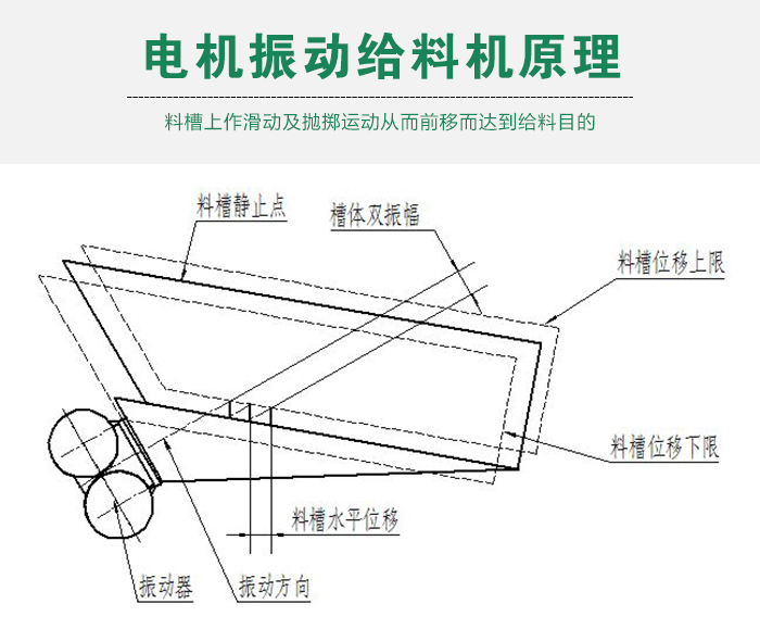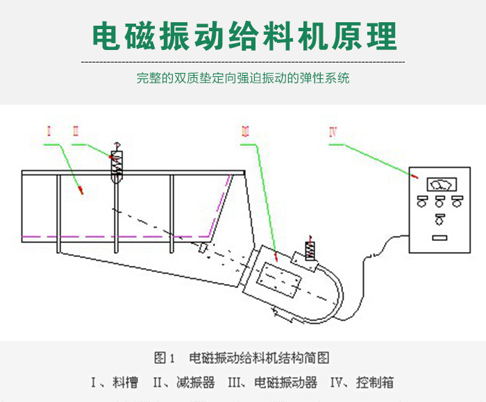 電磁振動給料機是一個較為完整的雙質墊定向強迫振動的彈性系統, 整個系統工作在低臨界共振狀態,主要利用電磁激振器驅動槽體以一定的傾角做往復振動,使物料沿槽移動。
