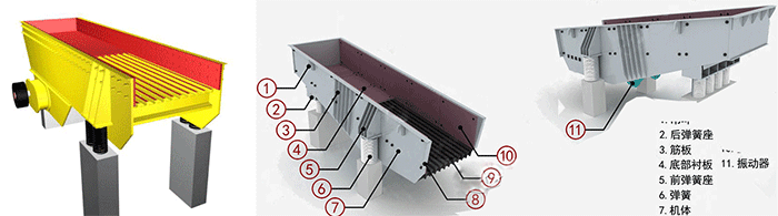 振動給料機是利用振動器中的偏心塊旋轉產生離心力,使篩廂、振動器等可動部分作強制的連續的圓或近似圓的運動。振動給料機是由給料槽體、激振器、彈簧支座、傳動裝置等組成。槽體振動給料的振動源是激振器,激振器是由兩根偏心軸(主、被動)和齒輪副組成,由電動機通過三角帶驅動主動軸,再由主動軸上齒輪嚙合被動軸轉動,主、被動軸同時反向旋轉,使槽體振動,使物料連續不斷流動,達到輸送物料的目的。