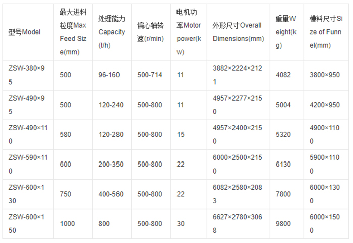 ZSW振動給料機主要由振動機架、彈簧、振動器、電機振動架及電機等組成。激振器個是由二特定位置的偏心軸以齒輪相嚙合組成,裝配時必須使兩齒輪按標記相嚙合,通過電機驅動,使兩偏心軸旋轉,從而產生巨大合成的直線激振力,使機體在支承彈簧上作強制振動,物料則以此振動為動力,在料槽上作滑動及拋擲運動,從而使物料前移而達到給料目的。當物料通過槽體上的篩條時,較小的料可通過篩條間隙而落下,可不經過下道的破碎工序,起了篩分的效果,提高了工作效率。